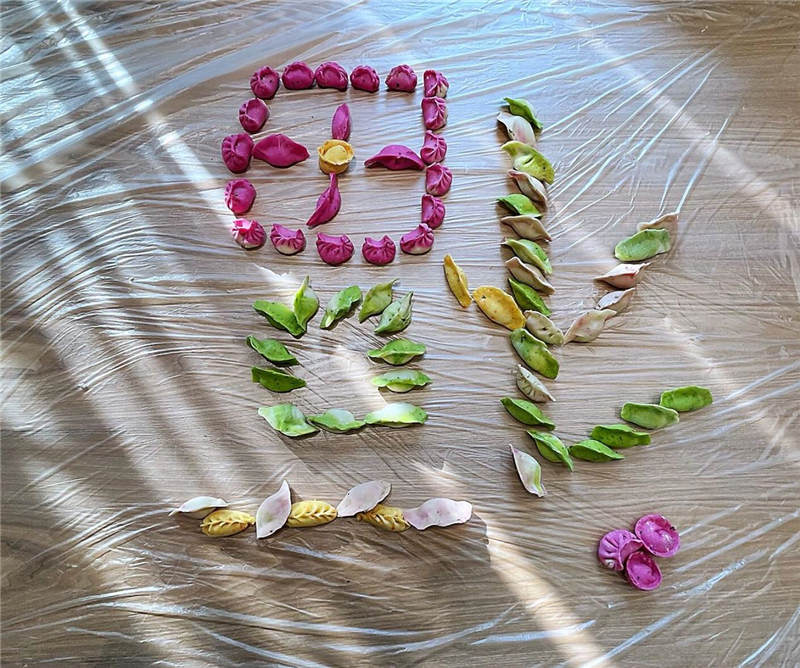 在活動(dòng)中,大家分工協(xié)作,井然有序,有人和面、有人拌餡、有人搟皮、有人包褶。再看看大家包的餃子,形態(tài)不一、極具創(chuàng)意,餃子皮的更是用色大膽,紅的、黃的、綠的。